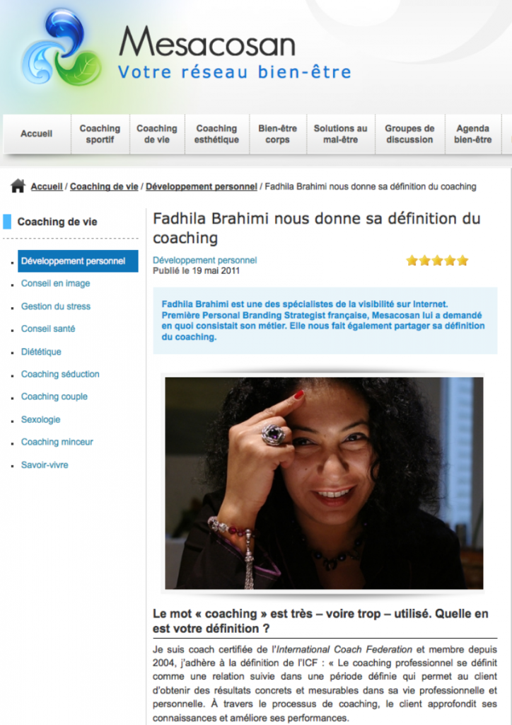 Sur la base de ces propos, tenus sur ce blog et lors d’échanges, l’équipe éditoriale de Mesacosan a souhaité m’interviewer. Dans cet article que vous pouvez consulter ici « Fadhila Brahimi nous donne sa définition du coaching » , je donne ma définition du coaching et explique ma pratique du coaching en Personal Branding.